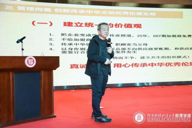 在下午的主题报告环节中,南开大学商学院经理、《南开管理评论》主编白长虹教授以“实践智慧与知识创造”为题,深入阐述数智时代管理学科理论与实践相互促进的关系,强调管理学研究应当与实践问题相结合,通过高质量案例研究撷取实践智慧,并且围绕“先锋企业”案例研究进行生动讲解。郑州大信家居创始人庞学元董事长在“与时偕行 向新而生”的报告中,从立新向善、系统向善和管理向善三个方面系统介绍了大信家居的《易简》大规模个性化定制模式、与博物馆相结合的超级体验经营模式,以及强调共生理念的组织管理模式。中铁装备信息与数字化院部长李东利、中原证券高级研究员石临源、海一云商集团总经理王燕燕分别结合各自研究或从事领域作主题报告。