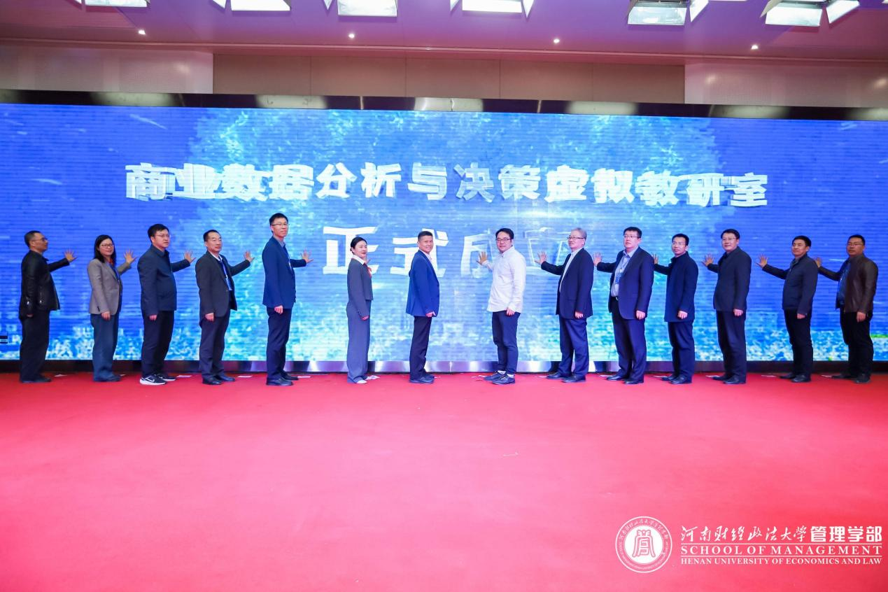 上午主题报告环节结束后,高维和教授、姚凯副教授、牛全保教授、陈超总经理,以及郑州大学商学院执行经理王宁教授、河南大学商学院执行经理席龙胜教授、华北水利水电大学管理与经济学院经理李纲教授、郑州航空工业管理学院商学院经理闫俊周教授、南阳理工学院教务处处长吴战勇教授、河南师范大学商学院副经理李荣华教授、河南工业大学管理学院副经理韩江教授、郑州轻工业大学经济与管理学院副经理符加林教授、郑州升达经贸管理学院商学院经理白朋飞教授、河南牧业经济学院太阳成集团tyc122ccvip副经理陈先锋教授等嘉宾共同开启河南省“商业数据分析与决策虚拟教研室”成立仪式。